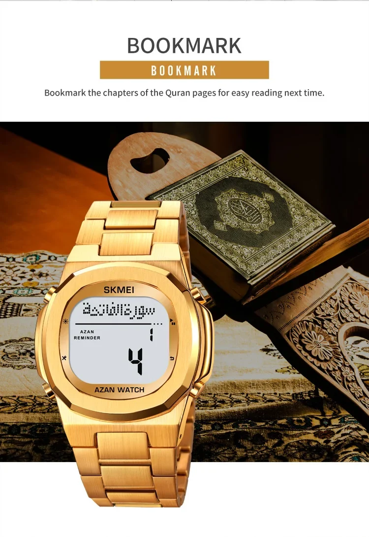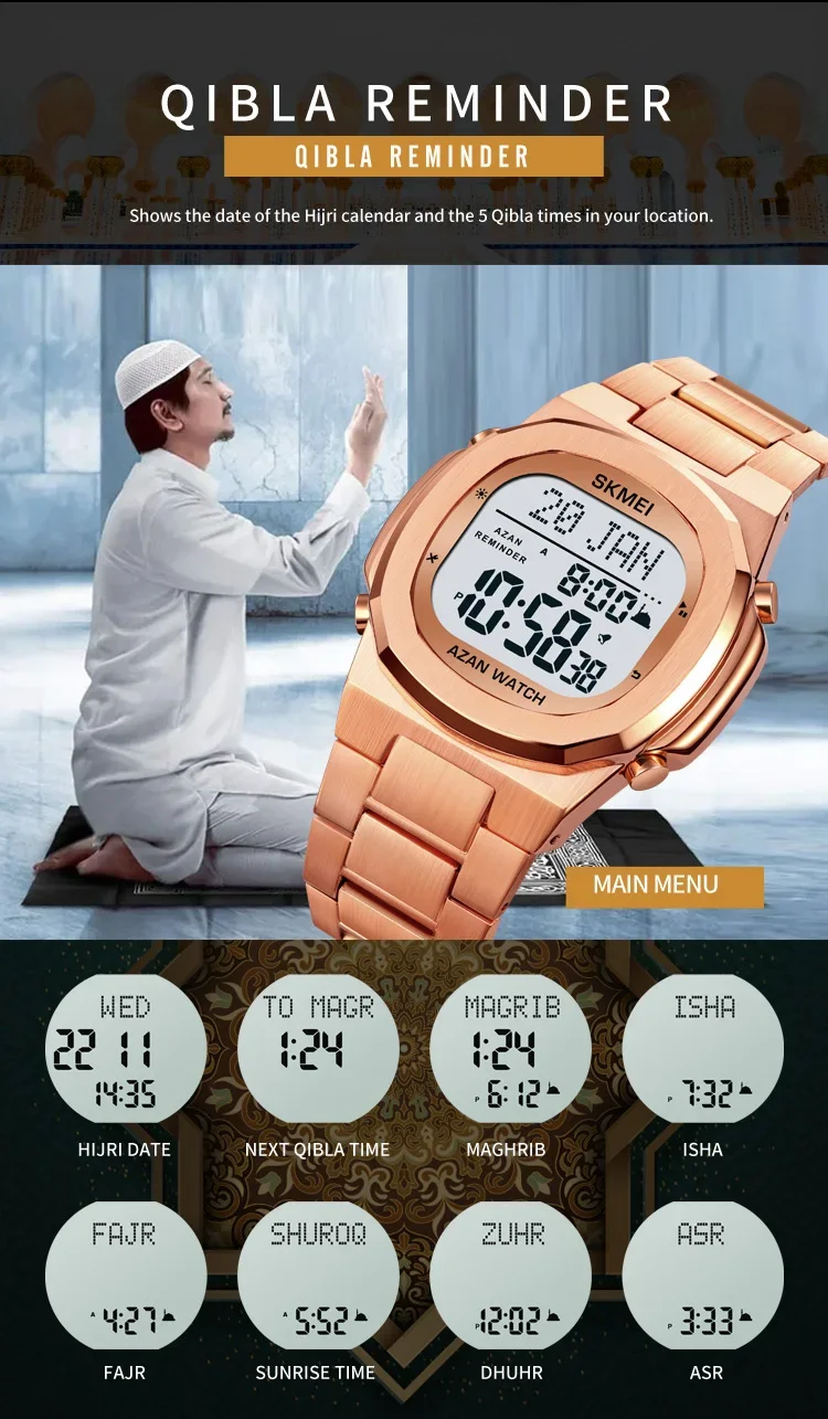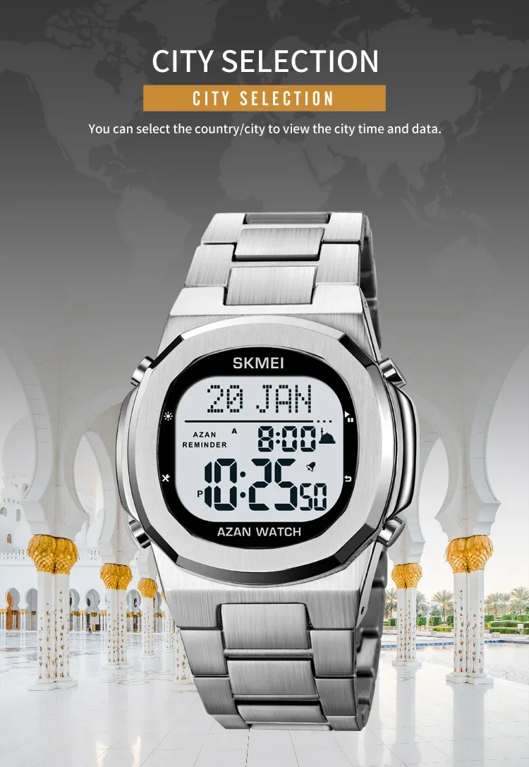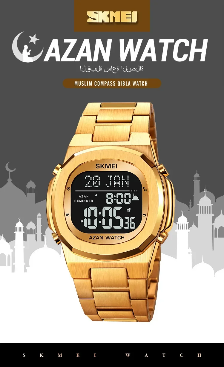 SKMEI-Montre-bracelet électronique étanche en acier pour homme, de luxe, Horloge de compte à rebours, Rappel de prière