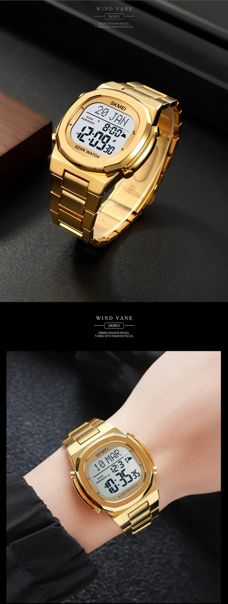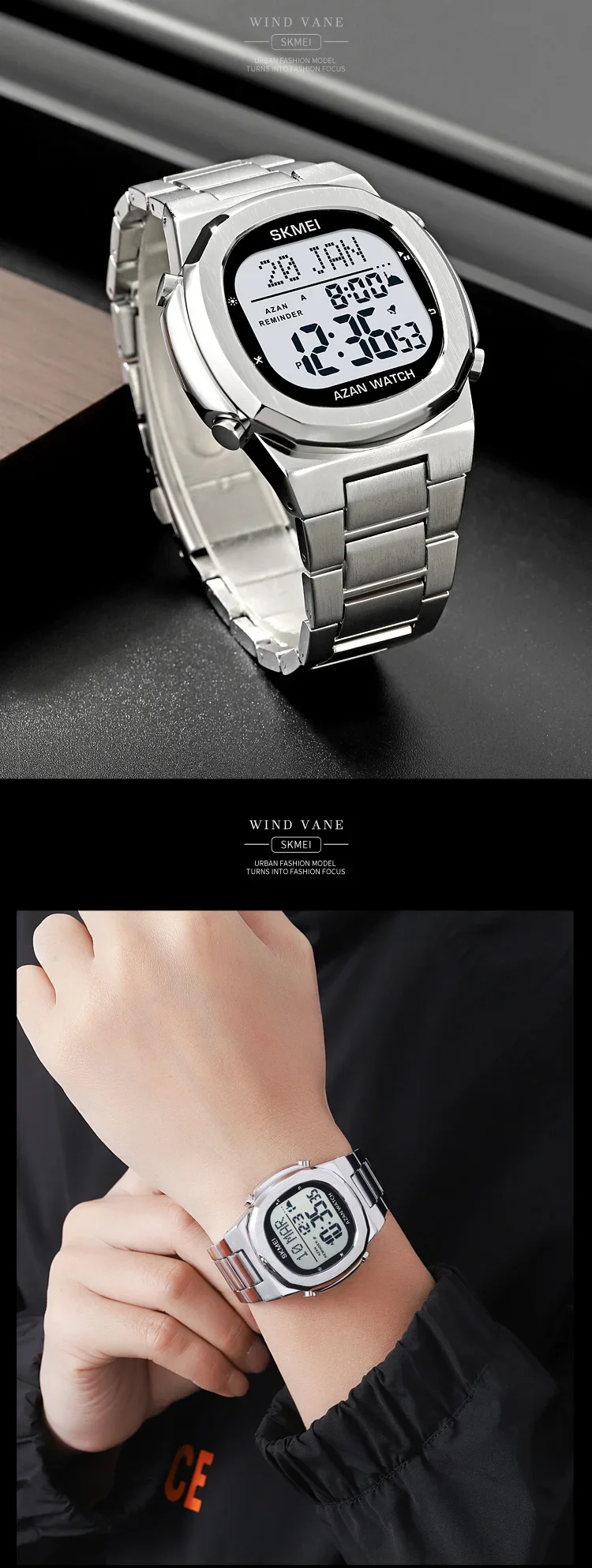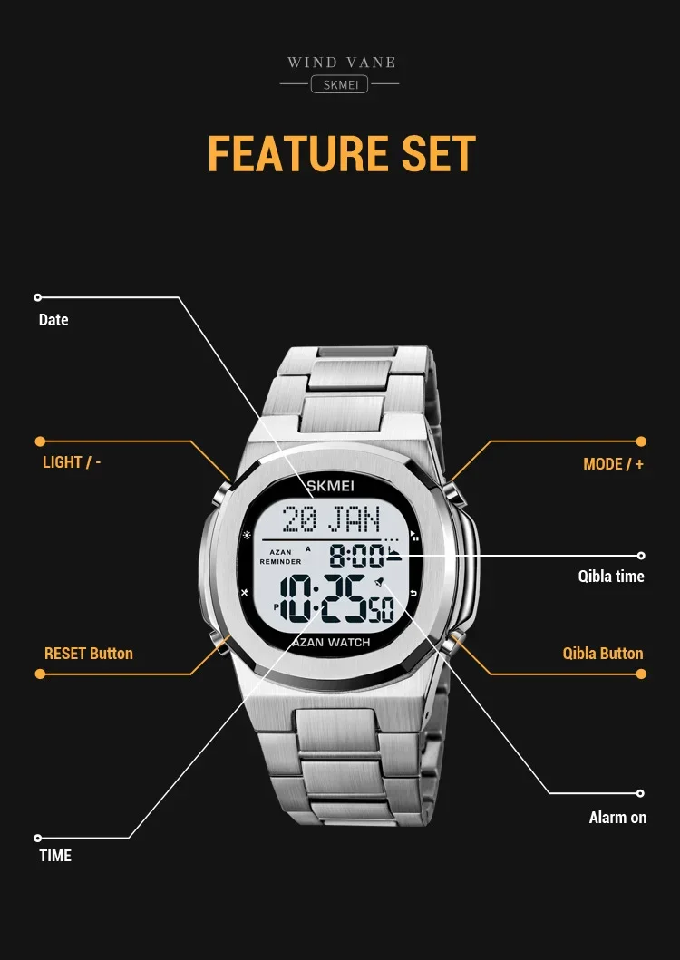 SKMEI-Montre-bracelet électronique étanche en acier pour homme, de luxe, Horloge de compte à rebours, Rappel de prière