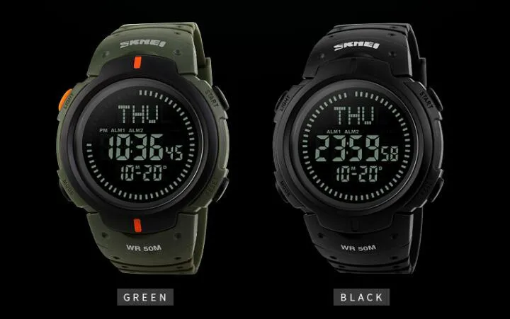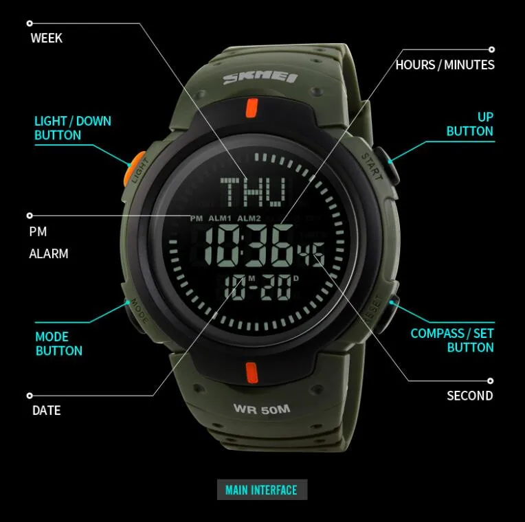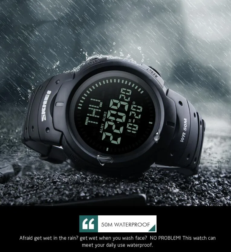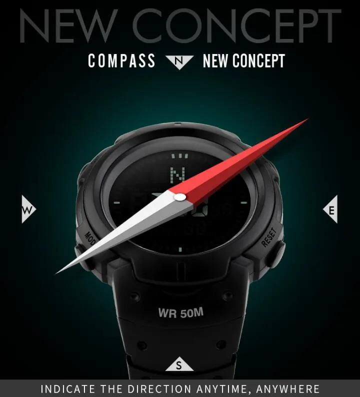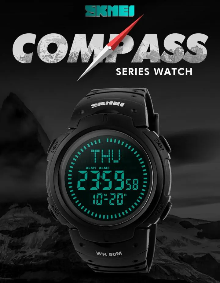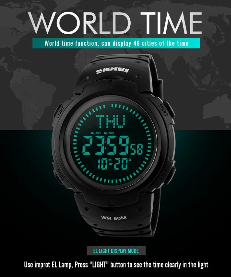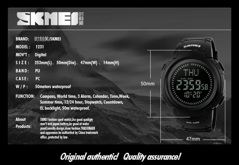 SKMEI 1231 est une montre de sport étanche conçue pour les randonneurs et les amateurs de plein air. Elle offre les fonctions de rétroéclairage, d’affichage de la semaine et de la date, de l’heure mondiale, du compas, du chronomètre et bien plus encore.